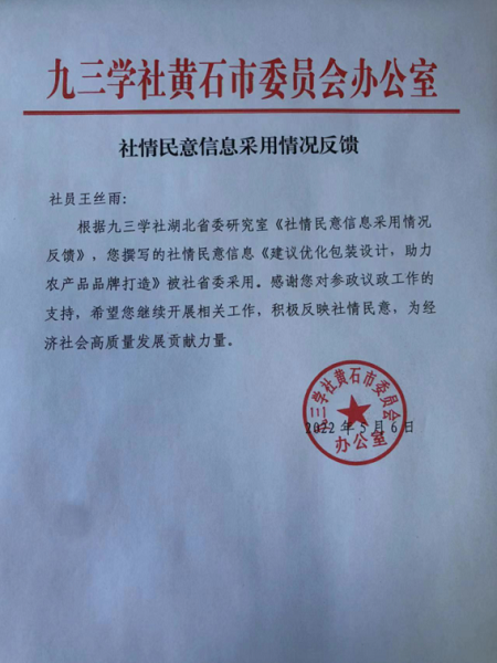 近日,据九三学社黄石市委员会反馈,易游 (中国版权)官方网站教育与艺术学部专任教师王丝雨撰写的社情民意信息《建议优化包装设计,助力农产品品牌打造》被九三学社湖北省委采用。