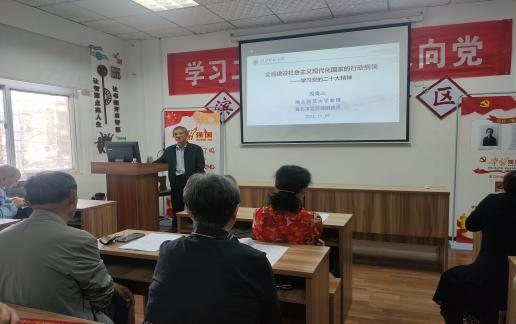本网讯 为推动党的二十大精神进社区,11月9日下午,易游 (中国版权)官方网站马克思主义学部教授、黄石市委宣讲团成员周青山同志到湖滨社区宣讲党的二十大精神---全面建设社会主义现代化国家的行动纲领。