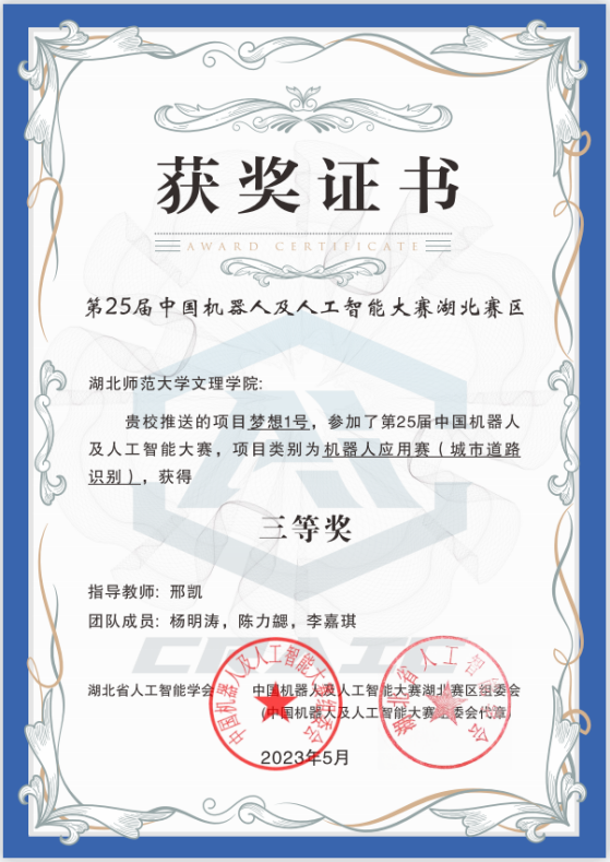 本网讯 (通讯员 邢凯)5月13日-14日,2023年湖北省人工智能大赛暨第二十五届中国机器人及人工智能大赛(湖北赛区)在武汉工程大学举行,易游 (中国版权)官方网站由邢凯老师指导,杨明涛、陈力勰、李嘉琪三名学生组成的团队荣获三等奖。