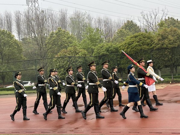 升旗仪式正式开始,国旗护卫队成员迈着整齐划一的步伐,护送着五星红旗正步走向旗杆,全体师生面向国旗肃立致礼。在雄壮的国歌声中,鲜艳的五星红旗迎着朝阳冉冉升起,迎风飘扬。