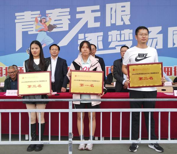 副校长张志华首先宣布了“体育道德风尚奖”和“优秀组织奖”得主,其中经济管理学部、理工学部、优能东风悦享汽车产业学院以及腾讯云大数据产业学院荣获“体育道德风尚奖”;迪科金融产业学院、教育与艺术学部以及人文学部荣获“优秀组织奖”。总裁判长何天畅宣布比赛成绩,迪科金融产业学院、翔宇航空产业学院以及人文学部分别斩获男子团体第一名、第二名、第三名;翔宇航空产业学院、人文学部以及迪科金融产业学院分别斩获女子团体第一名、第二名、第三名;翔宇航空产业学院、迪科金融产业学院、人文学部、东风悦享汽车产业学院、理工学部分别获得了团体总分的第一名、第二名、第三名、第四名和第五名。全体校领导为获奖集体颁奖。
