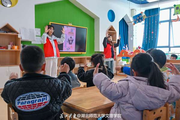 在健康科普宣讲教育中,志愿者结合幼儿认知特点,采用互动式宣教方式,通过播放原创《防流感儿歌》动画视频、示范《病毒退散歌》手势舞、教学《防疫儿歌》手指操等形式,生动讲解“七步洗手法”“科学佩戴口罩”“咳嗽礼仪”等健康防护知识。其中,“搓掌心”“筑围墙”“戴盾牌”等拟态动作设计,将健康知识转化为趣味互动,有效提升了幼儿的学习兴趣和宣教效果。孩子们在欢快的儿歌和手势舞中迅速掌握了“七步洗手法”,纷纷举起小手模仿“筑围墙”的动作,现场气氛热烈。