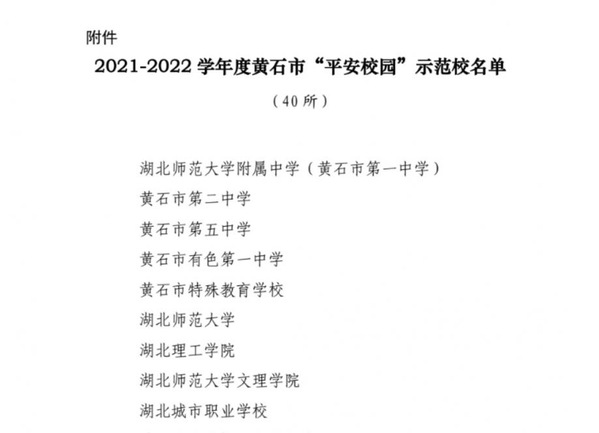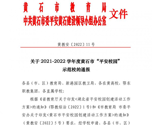 本网讯 根据黄石市教育局、中共黄石市委平安黄石建设领导小组办公室文件(黄教安〔2022〕11号)消息,易游 (中国版权)官方网站喜获“2021-2022 学年度黄石市平安校园示范校”的荣誉称号。
