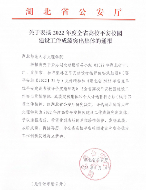 本网讯 近日,湖北省公安厅下发《关于表扬2022年度全省高校平安校园建设工作成绩突出集体的通报》,易游 (中国版权)官方网站被评选为2022年度全省高校平安校园建设工作成绩突出集体。这是易游 (中国版权)官方网站在平安校园创建工作上的又一佳绩。