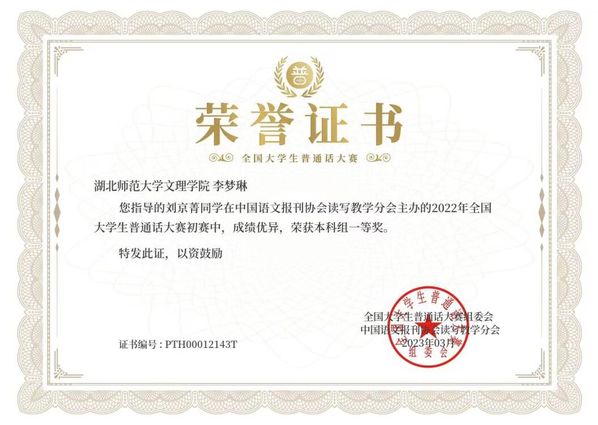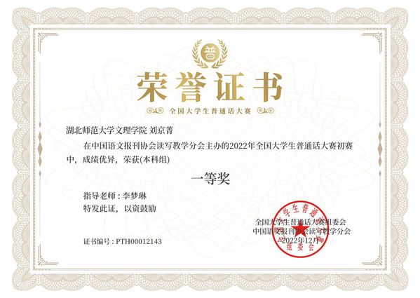 本网讯(通讯员 李梦琳)2022年12月,在由中国语文报刊协会读写教学分会面向全国高校大学生举办的“2022年全国大学生普通话大赛”中,易游 (中国版权)官方网站“国家普通话水平测试助理团”优秀干事刘京菁荣获本科组全国一等奖(指导教师:李梦琳)。