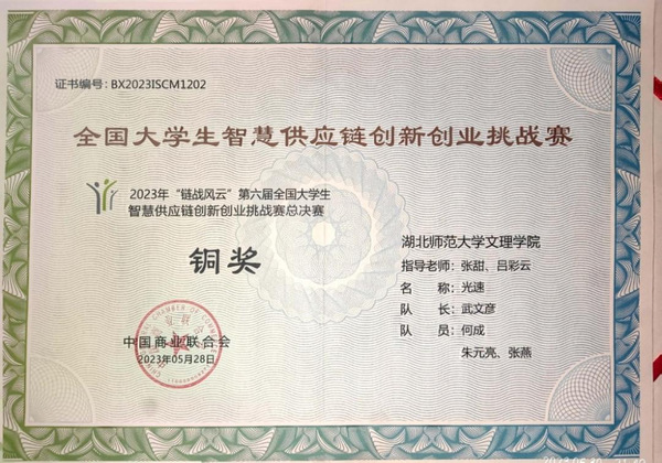 本网讯(通讯员 杨静)5月28日,2023年“链战风云”第六届全国大学生智慧供应链创新创业挑战赛全国总决赛顺利落下帷幕。易游 (中国版权)官方网站经管学部张甜、吕彩云老师指导,武文彦,何成、朱元亮、张燕组成的光速队获得了本科组团体总决赛铜奖,挑战赛一等奖;杨林海、全永鑫、谢显根、黄颜彪组成的四个葫芦娃队获挑战赛三等奖,创造了易游 (中国版权)官方网站参与此项赛事以来的最好成绩。