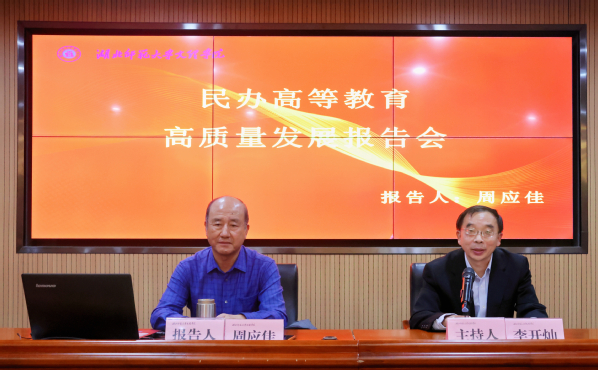 会上,周应佳教授回顾了湖北省民办高等教育的发展历程,指出湖北民办高等教育正处于转型期,要尤其注意内涵与特色的发展。他客观分析了民办高校的优势与短板。对新时期民办高等院校如何高质量地发展,周应佳提出三点建议:一是要充分认识优势,并发挥优势。民办高等院校在体制机制、经费使用、政府管控及社会负担等方面相比公办院校有更大优势,要充分利用好这些优势,推动学校高质量发展。二是要提升内涵,聚焦于内。宏观上抓好教育思想、文化建设、学科建设、人才培养及科学研究五大体系建设,中观上抓好专业、课程及实验室三大基本建设,微观上注重教学工作、教师队伍、生源质量等建设情况。三是要在发展过程中寻找新的突破点,发展本校特色。具体可以从校园文化、办学治校、学科建设、校园建设、学校管理等方面探索特色。他强调,没有特色的高校会缺乏长久的生命力,办学者需要艰苦不懈地寻找并形成属于自己的特色,这应是一所高校办学者的毕生追求。