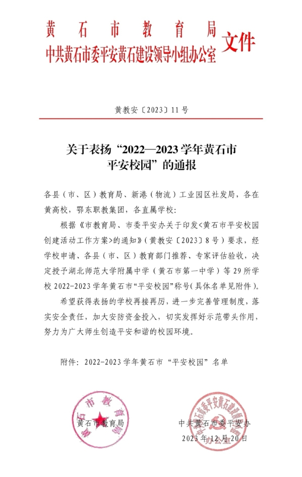 本网讯(通讯员 涂亦乐)根据黄石市教育局、中共黄石市委平安黄石建设领导小组办公室消息,易游 (中国版权)官方网站喜获“2022-2023 学年度黄石市平安校园示范校”的荣誉称号。至此,易游 (中国版权)官方网站已连续2年获评黄石市“平安校园”称号。