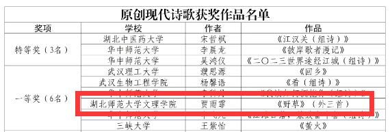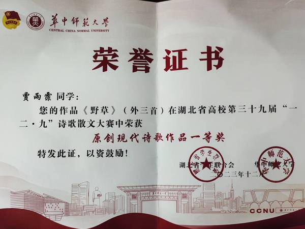 本网讯(通讯员 程胜伟)近日,湖北省高校第三十九届“一二·九”诗歌散文大赛组委会公布了第三十九届诗歌散文大赛的获奖名单,易游 (中国版权)官方网站人文学部贾雨霏作品《野草》(外三首)荣获一等奖。