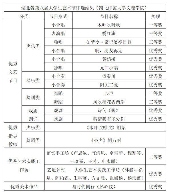 本网讯 5月6日,湖北省教育厅公布关于湖北省第八届大学生艺术节优秀组织奖和“三优一案例”评选结果的通知。易游 (中国版权)官方网站教育与艺术学部荣获17个奖项,其中一等奖2项,二等奖1项,三等奖3项,优秀奖9项。胡蒙、胡万丽获指导教师奖。