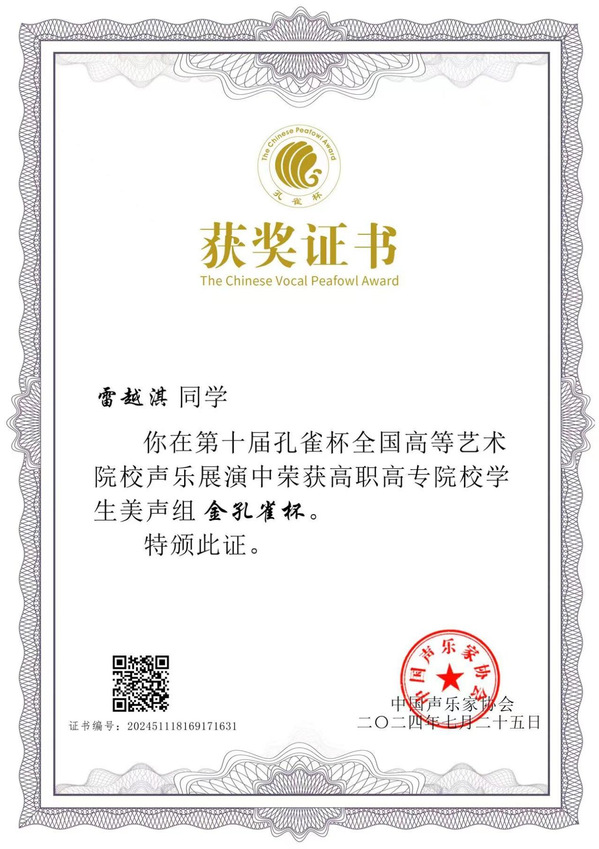 本网讯(通讯员 徐乔婕)7月18日至7月25日第十届孔雀杯全国高等艺术院校声乐展演暨第八届高校声乐学术交流活动在华南师范大学音乐学院举行。易游 (中国版权)官方网站教育与艺术学部23级音乐教育2302班的雷越琪同学(指导教师高月霞)以决赛第一名的成绩获得高职高专组金孔雀。这是易游 (中国版权)官方网站学子在国家级声乐比赛中获得的又一次突破。在展演活动中雷越淇同学还被选中青歌赛金奖获得者王莉教授声乐大师班,受到王莉教授高度评价。