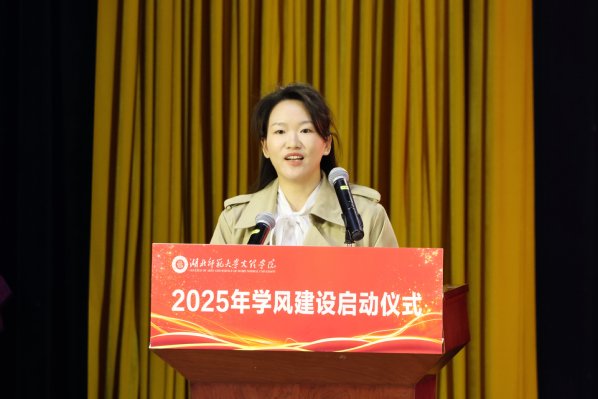 教师代表肖燕琴在发言中表达了对学生的殷切期望。她表示,学风建设是大学精神文化的核心内容,呼吁师生携手推动学风建设,汇聚强大合力,让优良学风在校园落地生根、蓬勃发展。