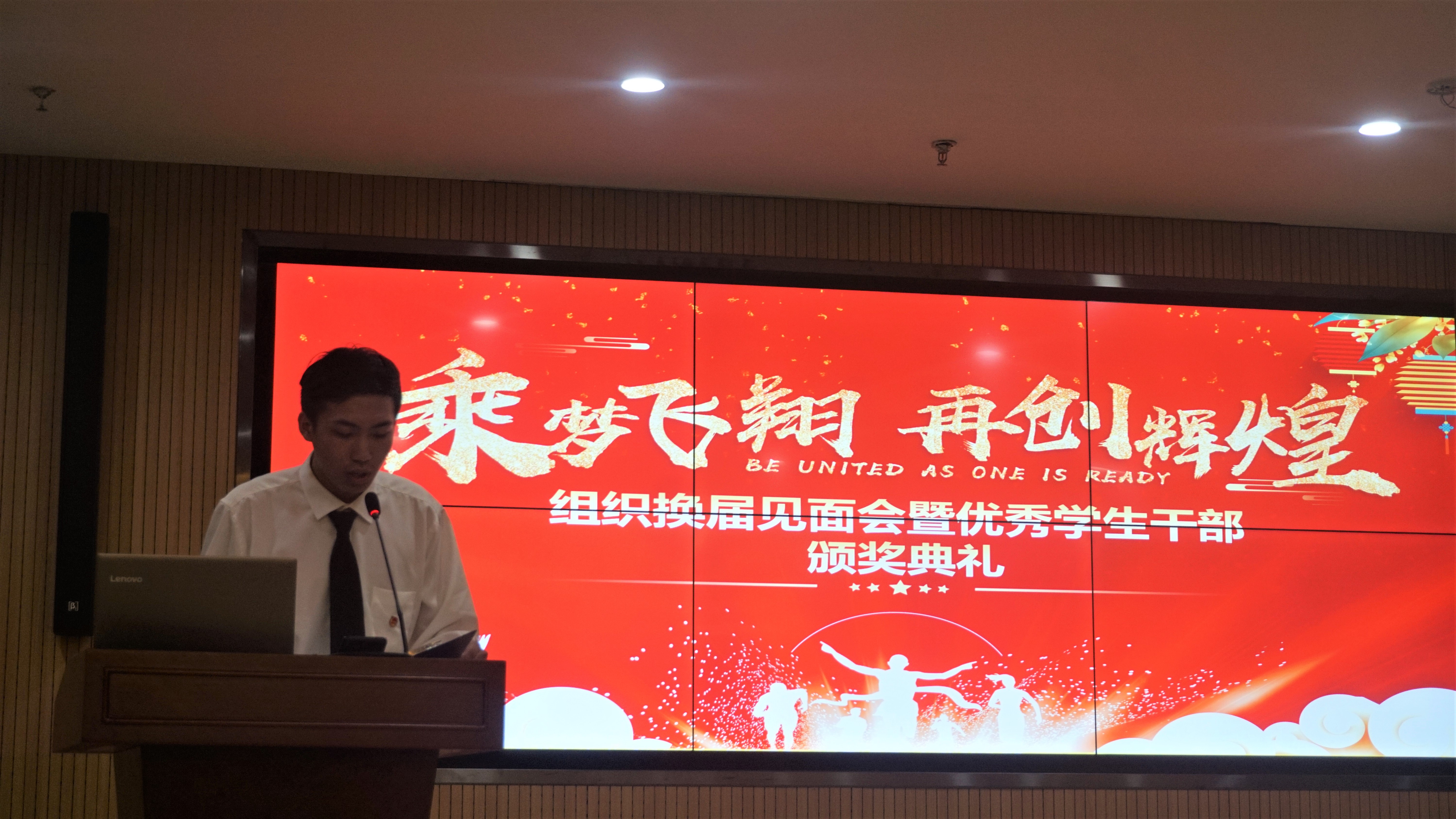 典礼在团歌声中拉开帷幕,上届优秀学生干部上台接受聘书,校团委学生副书记吴放、新任校团委学生副书记王利杭、学生会主席张冉、社团联合会主席李鲍月、团学主席管虎威作为第十届学生干部代表上台发言,对学校的肯定表示感激,对日后的团学工作给予期望。活动最后,陈小龙老师发表讲话,对第十届团学干部的辛勤工作表示感谢,对新任团学干部表示由衷的祝贺,对干部们提出主动、创新、严谨、有执行力这四点要求,期望团学干部们勇担责任,无惧压力与挑战,联系青年、服务青年,并对换届交接工作做出相关指导。
