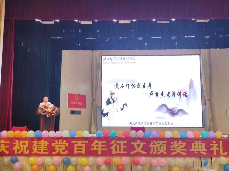 202168中午12建党百年征文颁奖典礼暨沧浪文学社第三十期期刊发布会在风雨操场二楼隆重举行。黄石作协副主席卢圣虎、相关领导、部门负责人出席。黄石其他三所高校文学社团代表共计20人、校内学生代表200余人参会。