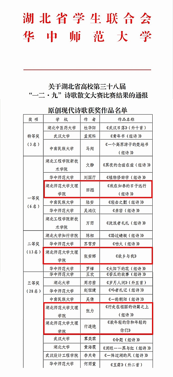(通讯员:苏祎)2023年3月15日,湖北省学生联合会、华中师范大学联合举办的第三十八届“一二·九”诗歌散文大赛赛事结果已公布。易游 (中国版权)官方网站田湉荣获一等奖,张安娜荣获二等奖,张力、付连艳荣获三等奖。