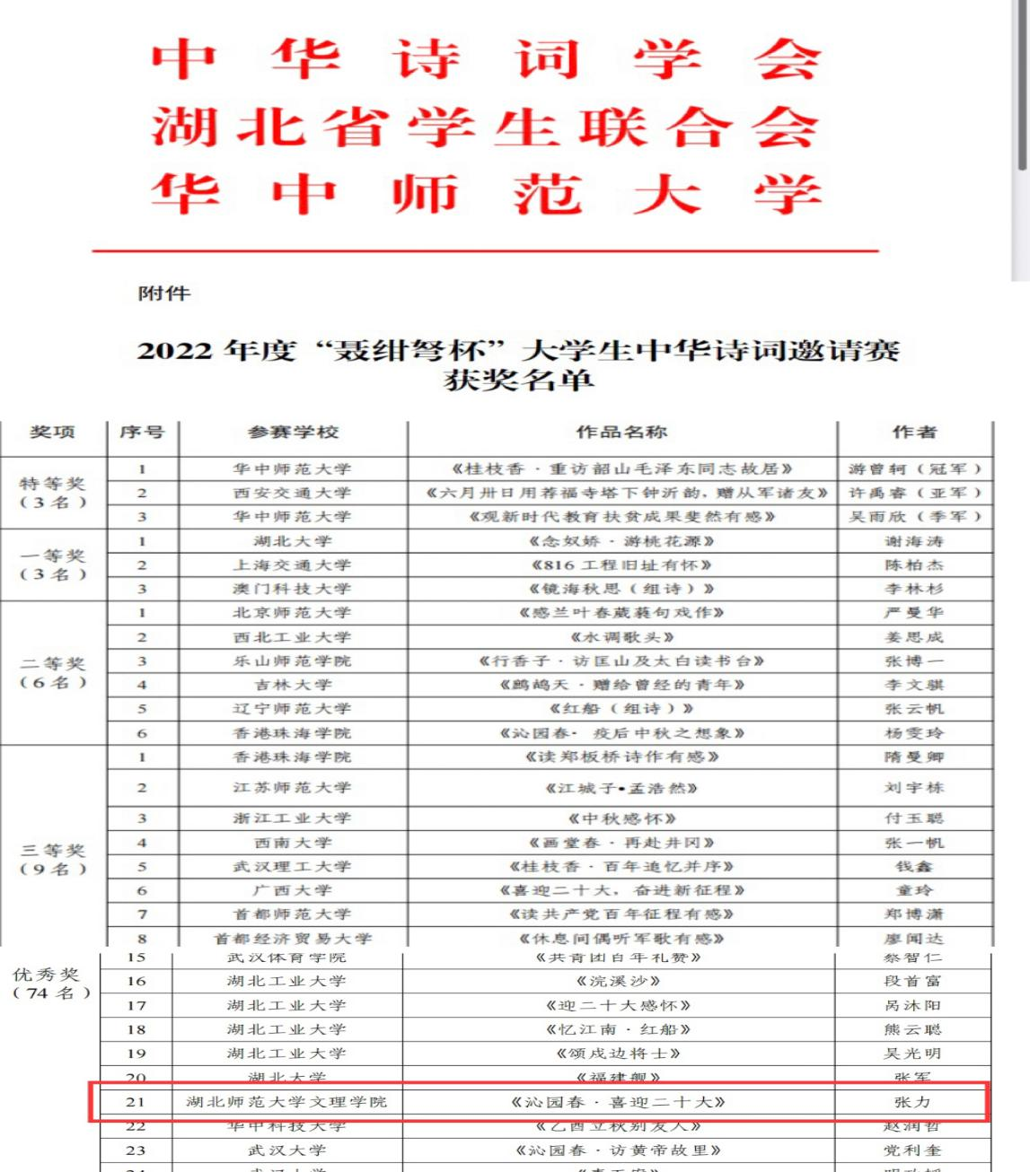 (通讯员:苏祎)6月6日,由中华诗词学会、中华诗词研究院、湖北省学生联合会、华中师范大学联合举办的2022年度“聂绀弩杯”大学生中华诗词邀请赛赛结果已公布。易游 (中国版权)官方网站张力同学荣获佳绩。