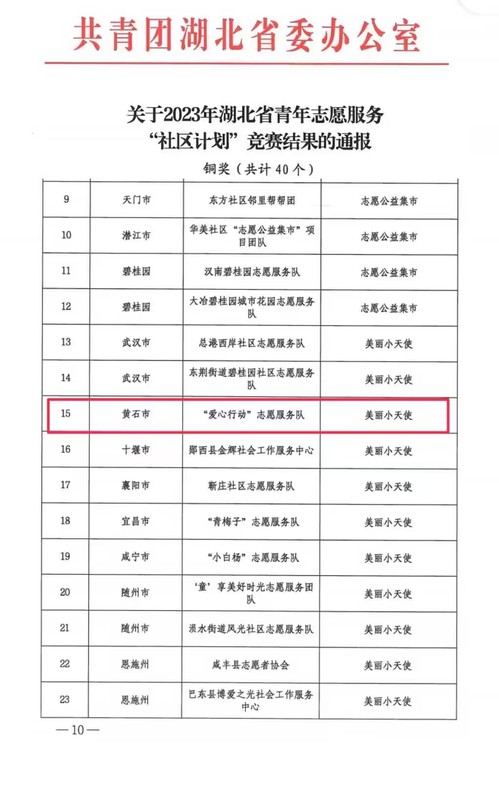 (通讯员:鲁奕琳)2023年12月12日,团省委联合省文明办、省民政厅、襄阳市人民政府联合举办的2023年湖北省青年志愿服务“社区计划”竞赛结果公布,易游 (中国版权)官方网站“爱心行动”志愿服务队荣获专项赛铜奖。