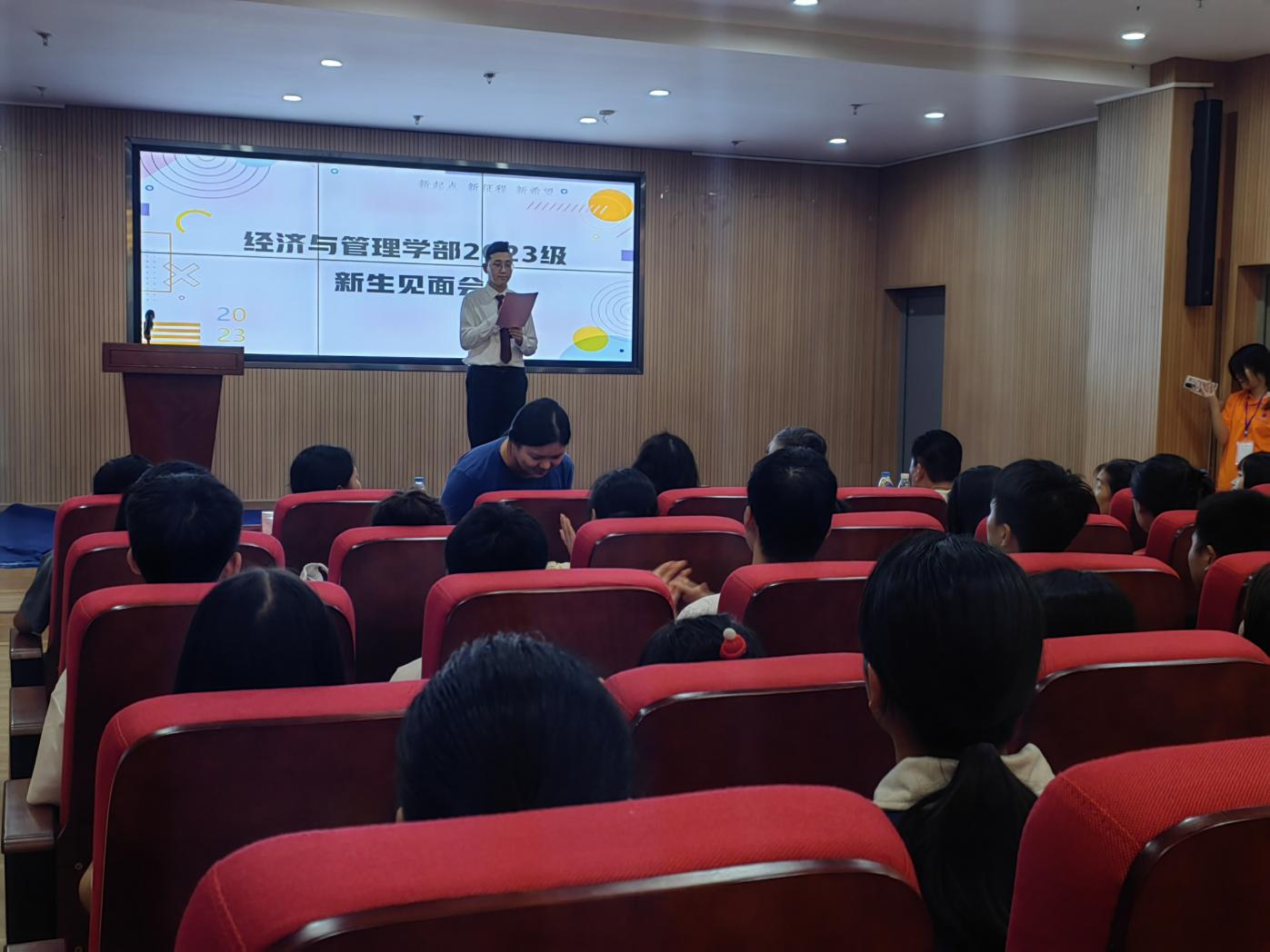 9月9日下午2点和3点半,经管学部在图书馆报告厅分别隆重召开互联网金融、物流管理和电子商务专业师生见面会,经济学和财务管理专业师生见面会,285名新生先后参加本次见面会,出席见面会的有学部主任商树松教授、党总支副书记罗铭、专业负责人葛子明和鲁千霞、各教研室主任、学部全体专任教师、行政办公室副主任杨静、教学秘书曾雨蓓、学生党支部书记吕彩云、团总支副书记姜希望、辅导员郑莎莎。