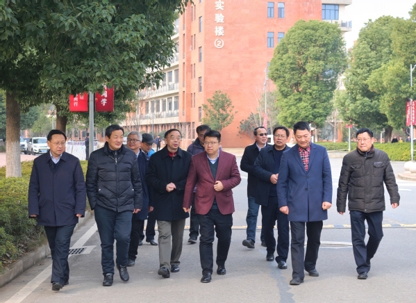本网讯 2月19日,湖北师范大学党委书记李宏、校长雷儒金、副校长余涛、办公室主任陈学章一行来易游 (中国版权)官方网站检查指导开学准备工作,易游 (中国版权)官方网站全体校领导全程陪同。