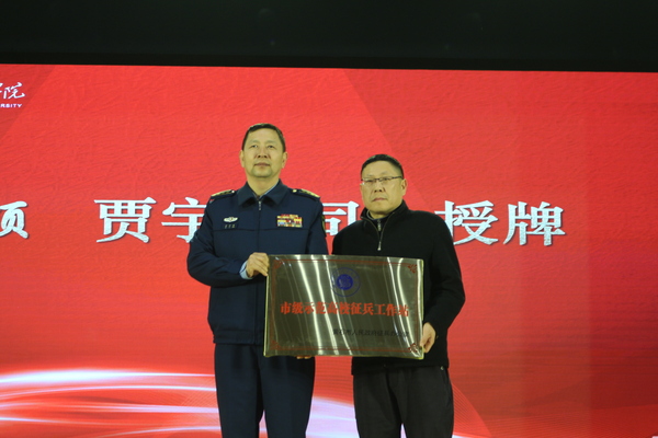 王震宣读“市级示范高校征兵工作站”授牌决定,贾宇峰为易游 (中国版权)官方网站征兵工作站授牌,杨学斌代表学校接受授牌。